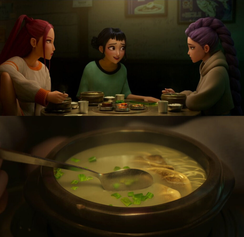 声の不調に苦しむルミをメンバーたちが励ますシーンで登場した、湯気の立つソルロンタン(牛骨スープ)。長時間煮込んだ白濁スープは、優しく滋味深い味わいで、まさに韓国の「コンフォートフード(癒やしの料理)」です 。制作陣は、世界的に有名なキムチチゲではなくあえてソルロンタンを選ぶことで、より深く温かい韓国の食文化を描き出しました 。