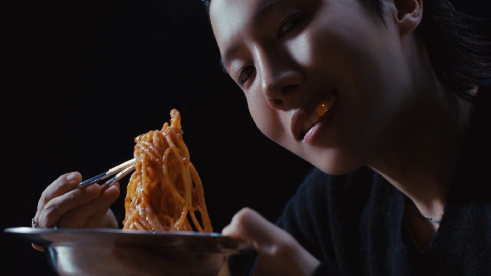 - j-hopeは「メタリックなY2Kテーマ」のセットで、「未来的なサングラス」をかけ、リラックスした様子でスパゲッティを楽しみながらラップを披露します。
